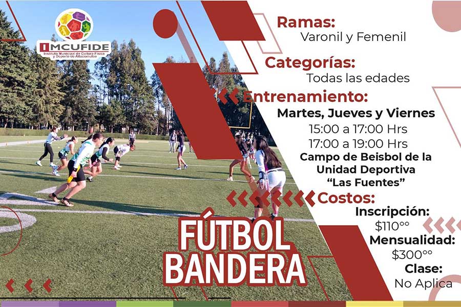 Por otro lado, el Fútbol Bandera se presenta como una opción inclusiva al estar disponible para participantes de todas las edades. Al igual que en el voleibol, el costo de inscripción se mantiene en $110.00, mientras que la mensualidad para esta rama es de $300.00. Las sesiones de práctica se llevan a cabo exclusivamente en el Campo de Béisbol de la Unidad Deportiva "Las Fuentes" durante los días martes, jueves y viernes.