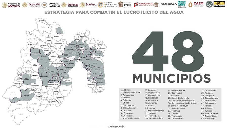 Con apoyo de la CONAGUA, la CAEM y los organismos municipales de agua, se desplegaron operativos simultáneos en 48 municipios de la entidad, con el propósito de intervenir más de 190 pozos y tomas de agua presuntamente vinculadas a la extracción, sobreexplotación, distribución, acaparamiento y venta ilegal del recurso.