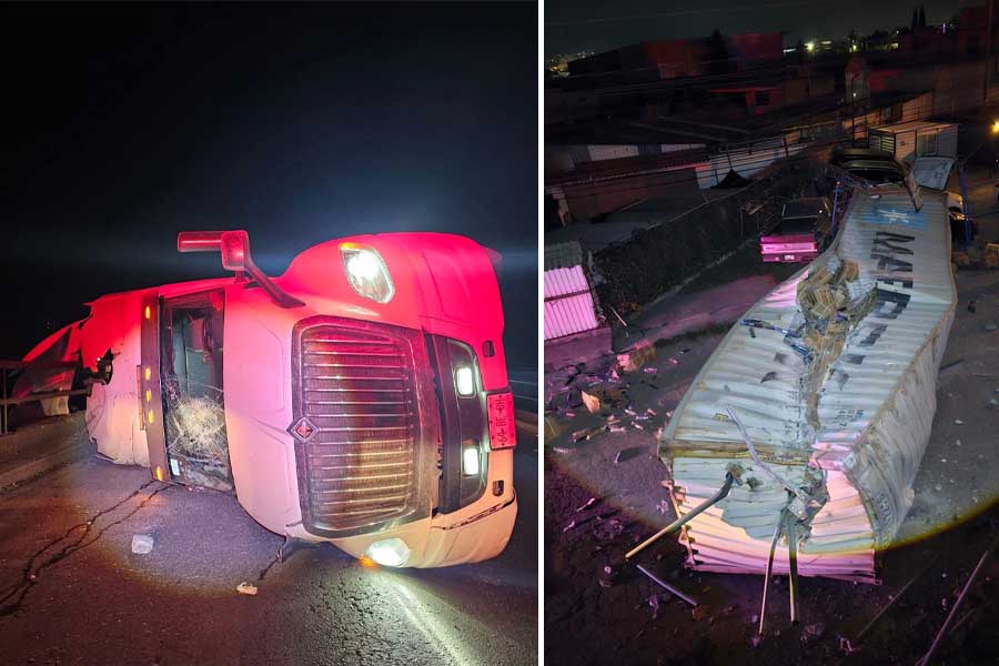De acuerdo con los primeros reportes, el conductor intentó tomar la salida, momento en el que se registró la volcadura, provocando que el contenedor cayera desde el puente hacia la vialidad lateral, en el mismo sentido de circulación.
