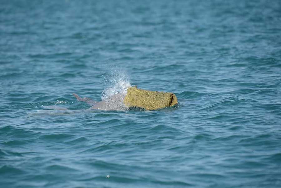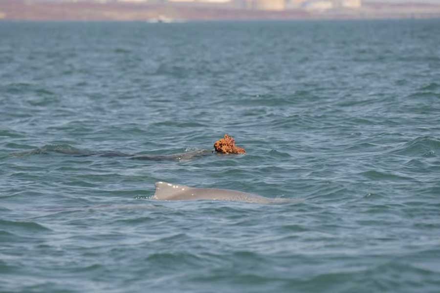 En el norte de Australia Occidental, miembros del Departamento de Conservación de la Biodiversidad y Atracciones (DBCA) captaron a algunos delfines jorobados (Sousa sahulensis) machos usando esponjas marinas como “peluca” como parte de su estrategia de cortejo.