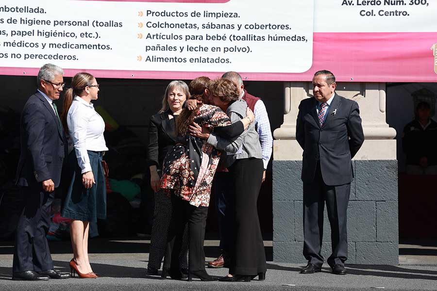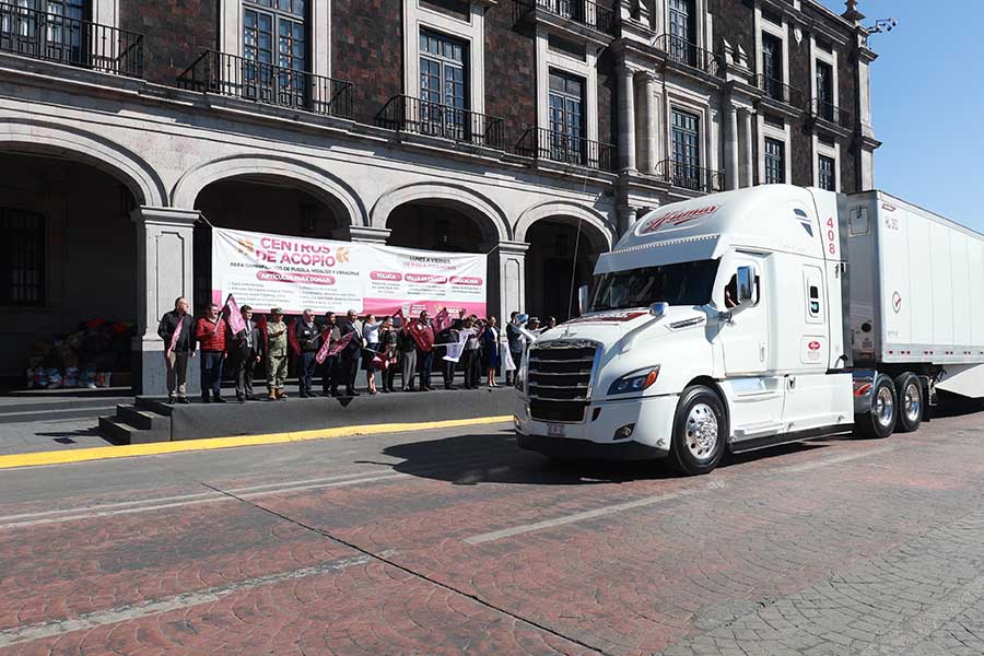 La gobernadora Delfina Gómez Álvarez dio el banderazo de salida a cuatro tráileres cargados con 70 toneladas de ayuda humanitaria que serán enviadas al estado de *Veracruz, de las cuales 46 toneladas fueron recaudadas por el Poder Judicial del Estado de México.