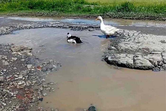 La problemática de los baches en los municipios del Valle de Toluca ha provocado afectaciones a automovilistas, ciclistas y peatones. Sin embargo, no todos lo ven como un desastre: dos patos aprovecharon un enorme bache para convertirlo en su improvisado estanque.