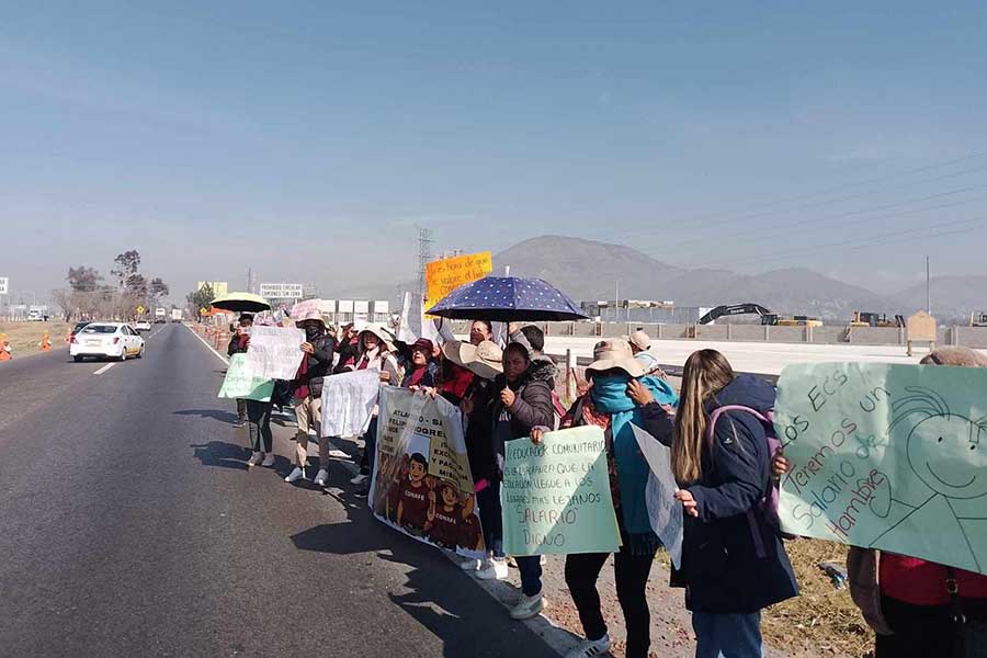 Profesores adscritos al Consejo Nacional de Fomento Educativo (CONAFE) se manifestaron la mañana de este viernes en las inmediaciones de la Caseta de Atlacomulco, para exigir mejores prestaciones y salarios justos.