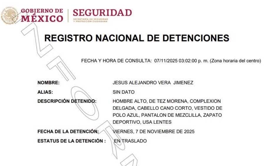 Cabe recordar que la Fiscalía Anticorrupción del Estado de Morelos difundió, en marzo de 2021, una ficha informativa en la que identificó a Jesús Alejandro Vera Jiménez como probable partícipe de hechos ilícitos, ofreciendo una recompensa de hasta 1,110 UMAS a quien aportara información útil y veraz que condujera a su localización, dentro de la causa penal JC/860/2017.