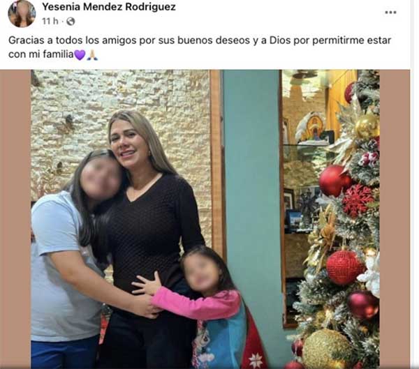 A través de redes sociales, Yesenia Méndez compartió una fotografía junto a sus hijas y señaló que ya se encuentra con su familia.