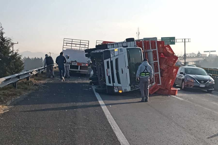 Un camión que transportaba pollos volcó la mañana de este miércoles sobre el Libramiento Lerma–Toluca, a la altura de Las Trojes, lo que generó importantes afectaciones viales* en la zona.