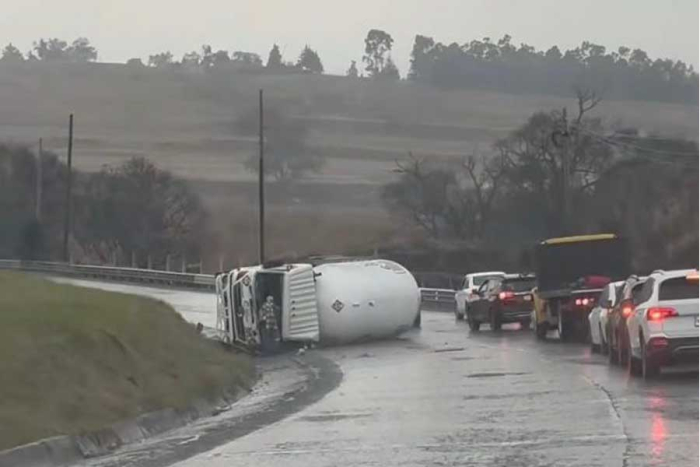De acuerdo con los primeros reportes, el accidente ocurrió a la altura del puente de San Bernabé, donde el pavimento mojado habría provocado que el conductor perdiera el control de la pesada unidad, la cual terminó recostada sobre su costado izquierdo.